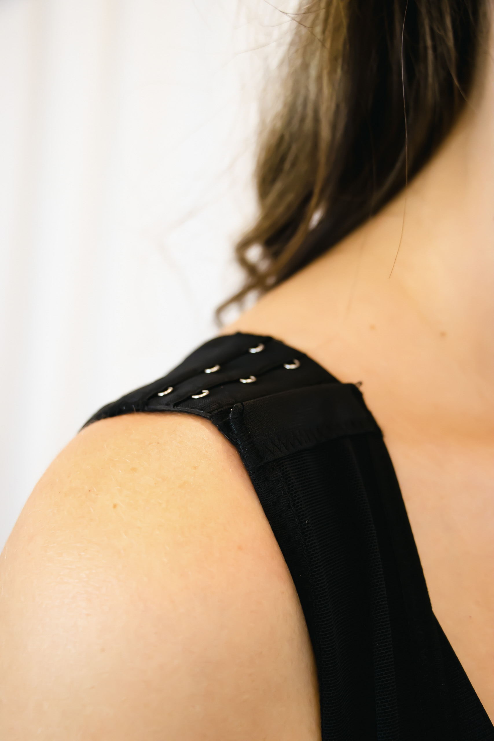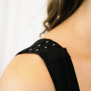 Syvän musta kangas ja kultaiset kiinnitykset luovat ylellisen ja viimeistellyn ilmeen. Tämä on muotoileva vaate, joka näyttää hyvältä myös sellaisenaan – ilman tarvetta piiloutua.